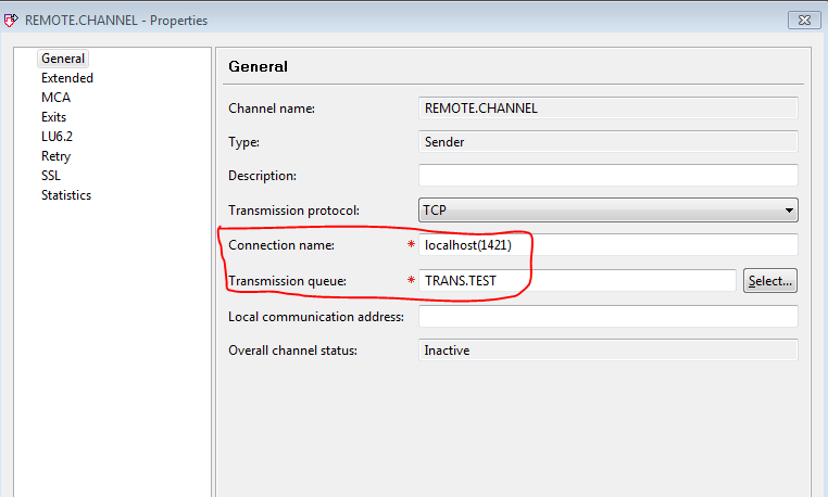 Pass connection name as host name and port to with we intend to connect (host name will be IP of other system or localhost and port will be listener port number of other system's or local queue manager like localhost (1421)) and transmission queue will be "TRANS.TEST". Click on finish and will get successful creation of message object.